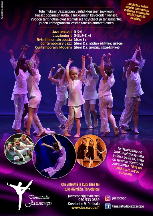 Tanssistudio Jazzscope on tanssikoulu pirkanmaalaisille aikuisille, nuorille ja lapsille. Jazzscope tarjoaa monipuoliset tunnit jazztanssin ja modernin tanssin harrastajille. Ryhmiä on eritasoisille ja -ikäisille tanssijoille aloittelijoista vaativan tanssitekniikan ja ilmaisun pariin. Jazzscope on tanssittanut ihmisiä vuodesta 1989. Tanssitilat löytyvät Pirkkalasta.